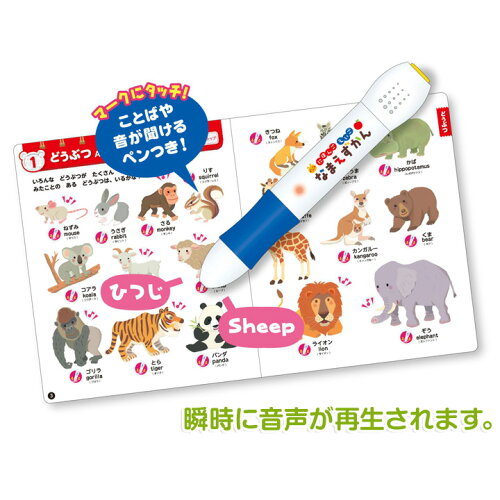 収録単語は、動物・乗り物・食べ物など500種類以上 にほんご えいご なまえずかん 収録テーマ どうぶつ とり かわやうみのいきもの やさい くだもの たべもの おかし・のみもの のりもの むし しょくぶつ みのまわりのもの がっき みにつけるもの あそび・スポーツ かお・からだ かぞく いえ しぜん まち いろ かず どうさのことば はんたいのことば あいさつ にほんご えいご なまえずかん - セット内容・製品仕様 セット内容 絵本×1 しゃべるペン×1 アルファベットポスター×1 仕様 収録単語数:531(動物・乗りもの・食べものなど) 絵本:22×18.8×3cm・厚紙・50ページ しゃべるペン:長さ18cm・太さ直径2.5cm・単4電池2本使用(お試し電池付属) アルファベットポスター:A3判・しゃべるペン対応